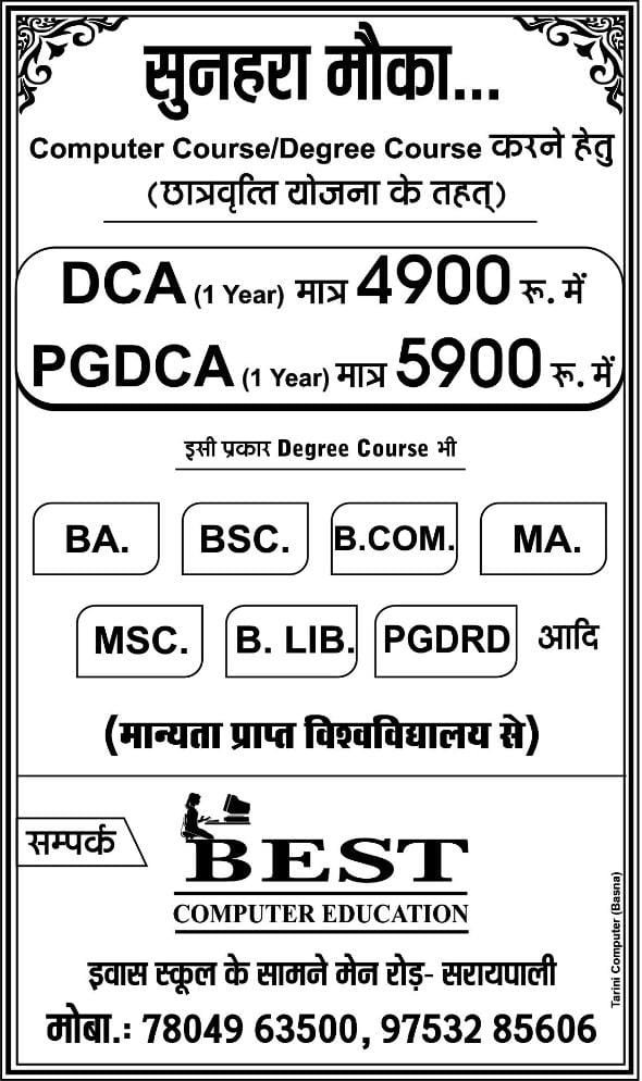 अंचल के लोगों के लिए शानदार मौका बेस्ट कम्प्यूटर सरायपाली में कम्प्यूटर कोर्स डिग्री कोर्स करने हेतु छात्रवृत्ति योजना के तहत DCA 1 year मात्र 4900 रूपये में PGDCA मात्र 5900 इसी प्रकार डिग्री कोर्स भी मान्यता प्राप्त विश्वविद्यालय से BA BSC B Com MA MSC BLIB PGDRD संपर्क करें इंवास इंग्लिश मीडियम स्कूल के सामने मेन रोड़ सरायपाली 7804963500, 9753285606 नोट यह योजना सीमित अवधि तक