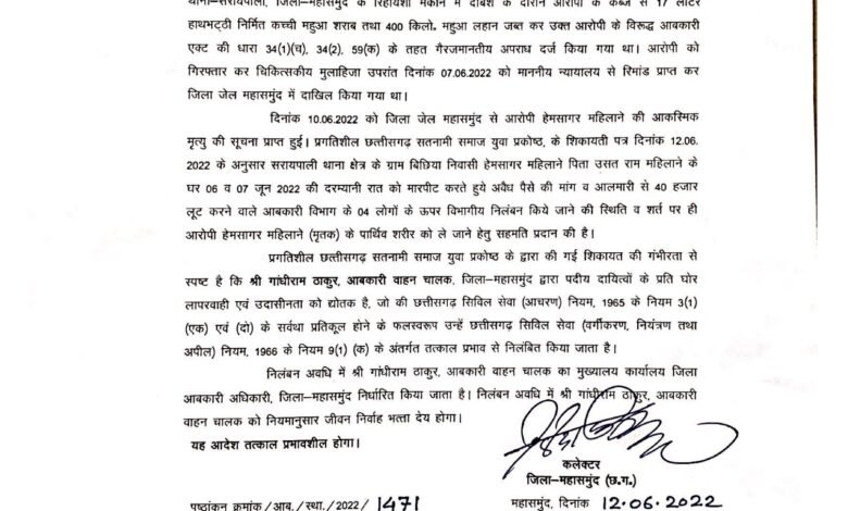 महासमुंद जिले के सरायपाली थाना अंतर्गत आबकारी विभाग के कर्मचारियों के ऊपर बड़ी कार्यवाही की गई है. अवैध शराब के मामले में जिला जेल में बंदी हेमसागर महिलांगे के संदिग्ध मौत के मामले में ज़िला कलेक्टर के निर्देशन में आबकारी विभाग ने कार्यवाही करते हुए आबकारी उप निरीक्षक उत्तम बुद्ध सहित 4 कर्मचारियों के खिलाफ बड़ी कार्यवाही की है.