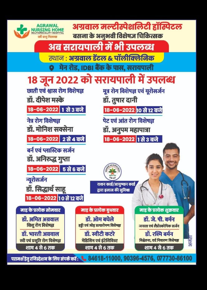 अग्रवाल डेंटल पालिक्लिनिक सरायपाली आईडीबीआई बैंक के बाजु में स्थित क्लिनिक में 18 जून को उपलब्ध रहेंगे छाती एवं श्वास रोग विशेषज्ञ डाक्टर दीपक मस्के दोपहर 1 बजे से 3 बजे तक डाक्टर तुषार दानी मुत्र रोग विशेषज्ञ 10 बजे से 12 बजे तक डाक्टर अनुपम महापात्रा पेट व आंत रोग विशेषज्ञ 1 बजे से 3 बजे तक डाक्टर सिध्दार्थ साहु न्युरो सर्जन 10 से 12 बजे तक डाक्टर अनिरुद्ध गुप्ता प्लास्टिक सर्जन 5 से 6 बजे तक डाक्टर मोनिष सक्सेना नेत्र रोग विशेषज्ञ 2 से 4 बजे तक पंजीयन के लिए संपर्क करे 7773086100, 8461811000