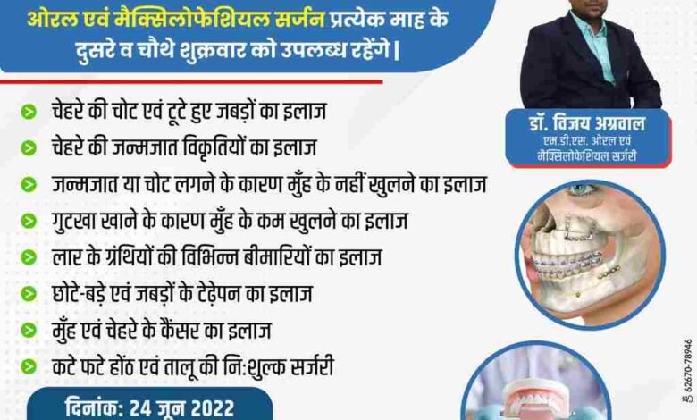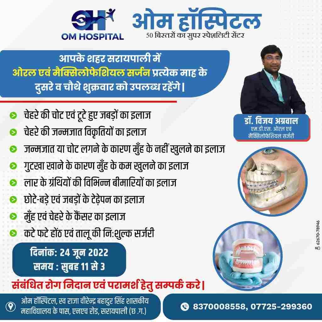 24 जून को सरायपाली ओम हॉस्पिटल में ओरल एवं मैक्सिलोफेशियल सर्जरी विशेषज्ञ डॉ विजय अग्रवाल रहेंगे उपस्थित