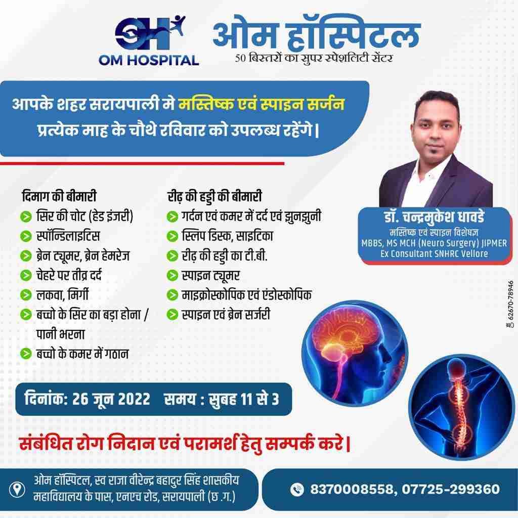 26 जून को सरायपाली ओम हॉस्पिटल में मस्तिष्क एवं स्पाइन विशेषज्ञ डॉ चन्द्रमुकेश धावड़े रहेंगे उपस्थित