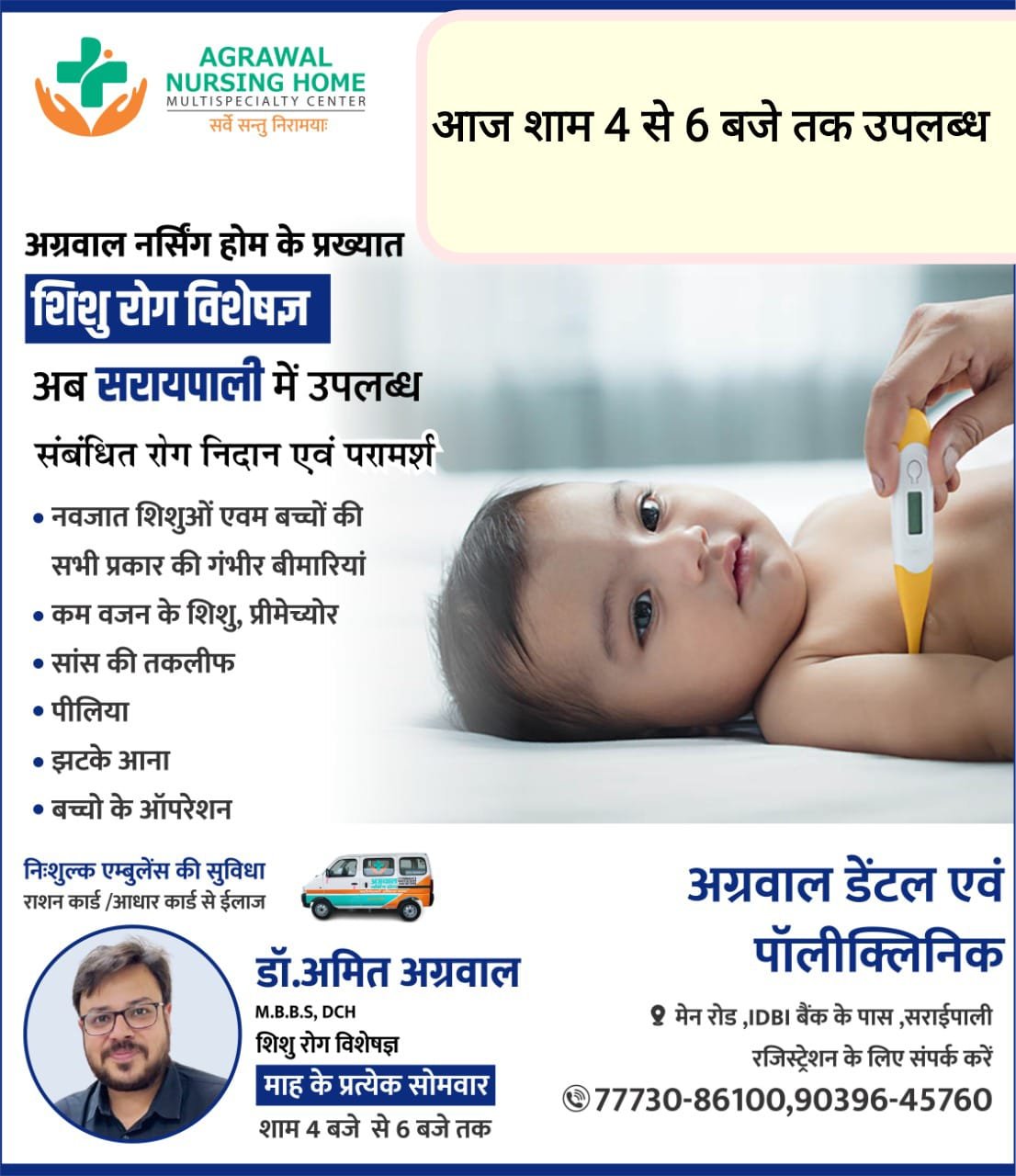 अग्रवाल नर्सिंग होम बसना के प्रख्यात शिशु रोग विशेषज्ञ डाक्टर अमित अग्रवाल आज अग्रवाल डेंटल पालिक्लिनिक सरायपाली में उपलब्ध रहेंगे