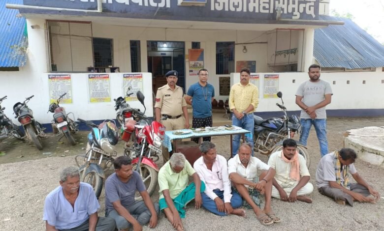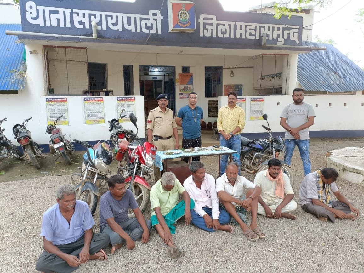 जिला महासमुंद के अपराध एवं अपराधिक गतिविधियों पर अंकुश लगाने के मुहिम के तारतम्य में जिले के समस्त थाना एवं चौकी प्रभारियों को जिले में अवैध जुआ सट्टा पर अंकुश लगाने हेतु निर्देशित किया गया था। अवैध गतिविधियों में संलिप्त लोगों के धरपकड़ के इसी क्रम में थाना सरायपाली में पदस्थ निरीक्षक आशीष वासनिक को जरिए मुखबिर के सुचना मिला की ग्राम जंगलबेड़ा के जंगल मैं कुछ लोग 52 पत्ती ताश से रुपए पैसे का हार जीत का दाव लगाकर काट पत्ती नामक जुआ खेल रहे हैं की सूचना पर हमराह स्टाफ अवैध जुआ कार्यवाही हेतु मौके पर पहुंचकर जुआ खेल रहे व्यक्तियो को घेराबंदी कर अवैध जुआ खेलते रंगे हाथों पकड़े जाने पर एवम उनका नाम पता पुछने पर अपना नाम (1) टीकाराम पटेल पिता बुधराम पटेल उम्र 70 वर्ष साकिन जंगलबेड़ा तोरेसिहा थाना सरायपाली (2) रंजन प्रधान पिता लेकरू प्रधान उम्र 50 वर्ष साकिन तालपदर थाना बिजेपुर जिला बरगड़ उड़ीसा (3) नवीन यादव पिता मंगलु यादव उम्र 60 वर्ष साकिन जंगलबेड़ा थाना सरायपाली (4) सनू भोई पिता बरबल भोई उम्र 40 वर्ष साकिन खिरापाली थाना जगदलपुर बरगड उड़ीसा (5) जलंधर चौधरी पिता सेतराम चौधरी उम्र 32 वर्ष साकिन जंगलबेडा थाना सरायपाली(6) विक्रम प्रधान पिता नारायण प्रधान उम्र 40 वर्ष साकिन बेतालभाटा थाना जगदलपुर बरगड़ उड़ीसा (7) चंद्रमणि प्रधान पिता नारायण प्रधान उम्र 65 वर्ष साकींन बैदपाली थाना सरायपाली का होना बताया जिनके कब्जे से नगदी रकम 80190 रूपए 52 पत्ती ताश, 03 नग मोबाइल 03 नग मोटरसाइकल मुताबिक जब्ती पत्रक के जप्त किया गया आरोपीयो का कृत्य अपराध धारा 13 जुआ एक्ट का पाए जाने से आरोपियों के विरुद्ध थाना सरायपाली में अपराध क्रमांक 276/2022 धारा 13 जुआ एक्ट कायम कर विवेचना में लिया गया संपूर्ण कार्यवाही में एसआई विनोद नेताम आर योगेन्द्र दुबे योगेंद्र बंजारे मानवेंद्र ढीढी चंद्रमणि यादव अनिल मांझी राहुल वर्मा मोहन साहू व समस्त स्टाफ थाना सरायपाली का योगदान रहा।