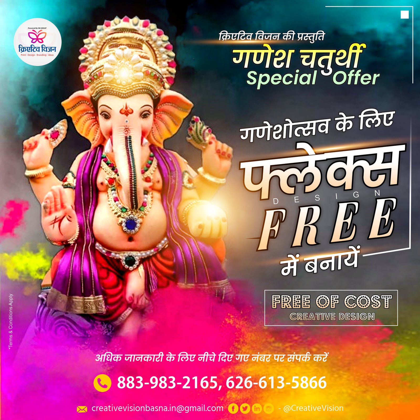 सरायपाली : क्रिएटिव विजन गणेश चतुर्थी आंफर गणेशोत्सव के लिए फलैक्स डिजाइन फ्री में बनवाये