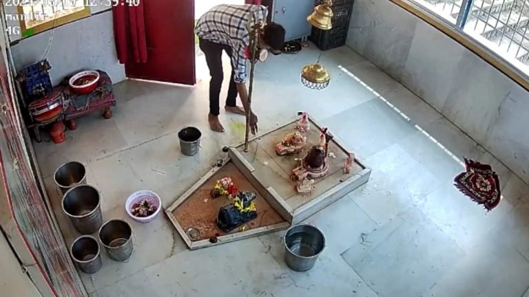 मंदिर में रखे जल चढ़ाने तांबे का लोटा, पूजा के लिए रखी गई आरती सामग्री को चुराने से पहले चोर ने भगवान को प्रमाण किया, फिर सामान लेकर नौ-दो ग्यारह हो गया. यह पूरी घटना मंदिर में लगाए गए सीसीटीवी कैमरे में कैद हो गई है.