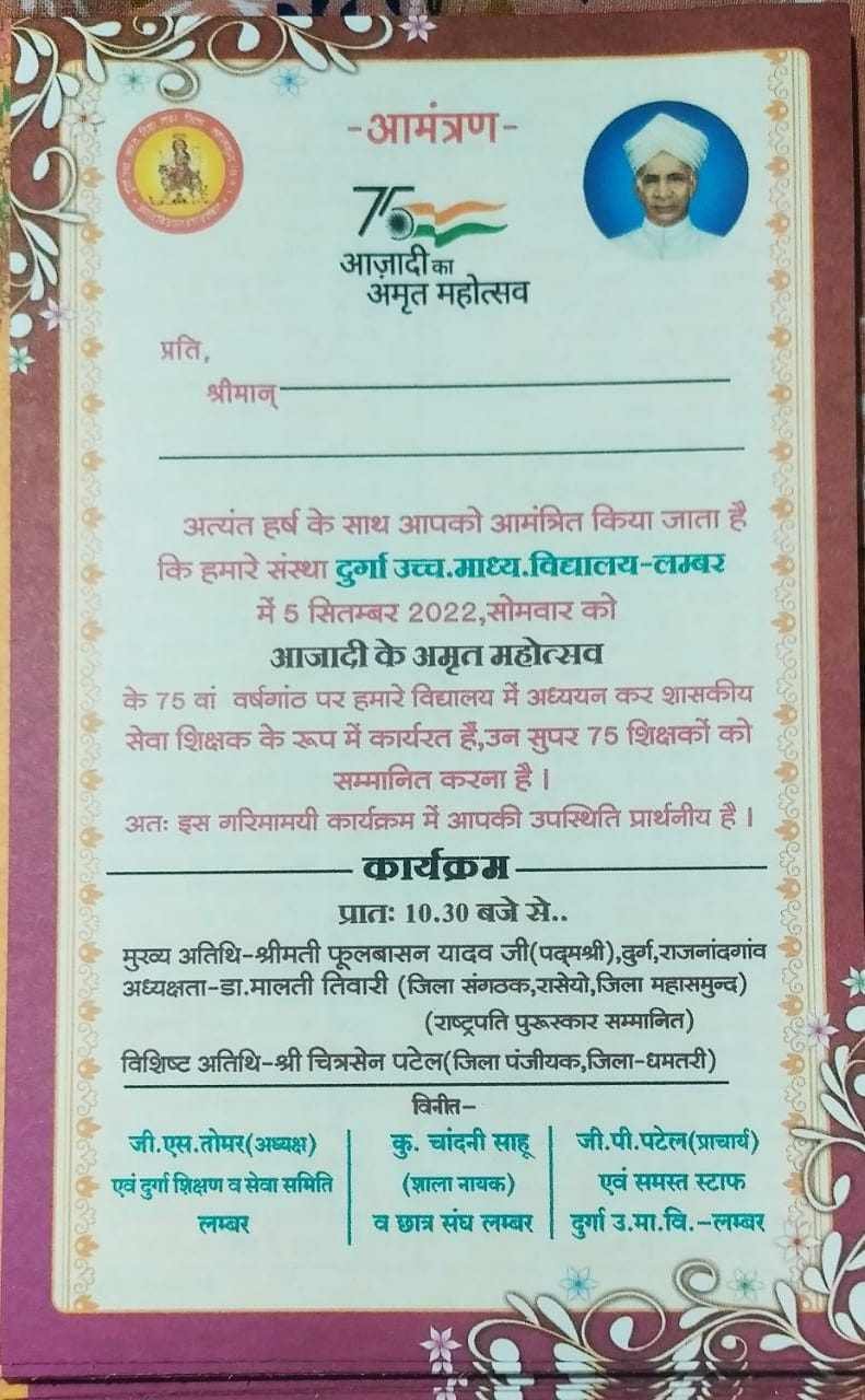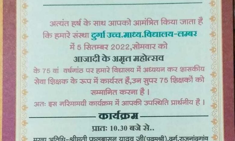 बसना – महासमुंद जिले के दुर्गा उच्च. माध्यमिक विद्यालय लम्बर में 5 सितंबर को आजादी के अमृत महोत्सव के 75 वां वर्षगांठ पर आयोजित शिक्षक सम्मान समारोह पर सुपर 75 शिक्षकों को सम्मानित करने का लक्ष्य रखा गया है कार्यक्रम की मुख्य अतिथि पद्मश्री फूलबासन यादव, अध्यक्षता डॉक्टर मालती तिवारी जिला संगठक रासेयो महासमुंद, विशिष्ट अतिथि चित्रसेन पटेल जिला पंजीयक धमतरी रहेंगे,