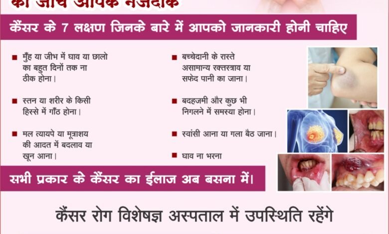 अग्रवाल नर्सिंग होम बसना में अब कैंसर रोग विशेषज्ञ डाक्टर रमेश कोठारी 13 सितंबर को सुबह 10 बजे से 1 बजे तक उपलब्ध रहेंगे कैंसर के 7 लक्षण जैसे मुंह या जीभ में घाव का बहुत दिनों तक ठीक न होना, स्तन या शरीर के किसी हिस्से में गांठ होना, मल त्यागने या मुत्राशय की आदत में बदलाव या खून आना, बच्चेदानी के रास्ते असमान्य रक्तसाव्र या सफेद पानी आना, बदहजमी और कुछ भी निगलने में समस्या, घाव न भरना आदि समस्याओं से जुड़ी जानकारी व पंजीयन के लिए संपर्क करे अग्रवाल नर्सिंग होम बसना मोबाइल 7770868473, 7773086100