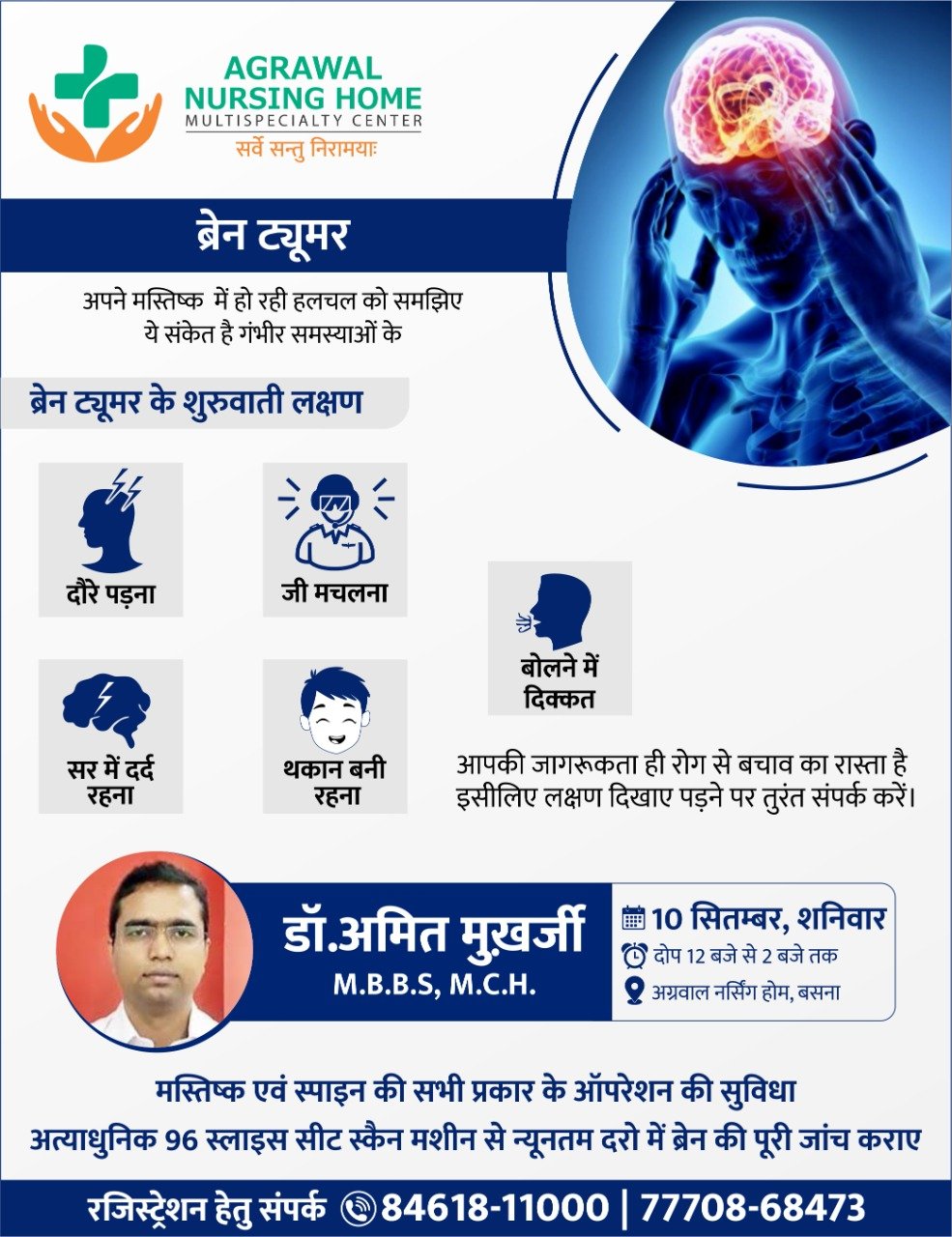 अग्रवाल नर्सिंग होम बसना में 10 सितंबर को उपलब्ध रहेंगे सुबह 9 बजे से 12 बजे तक डाक्टर अमित मुखर्जी मस्तिष्क व स्पाइन रोग विशेषज्ञ ब्रेन ट्यूमर के लक्षण दौरे पड़ना , जी मचलना , बोलने में दिक्कत , थकान बनी रहना आदि लक्षण दिखाई देने पर तुरंत संपर्क करे पंजीयन के लिए संपर्क करे 7773086100