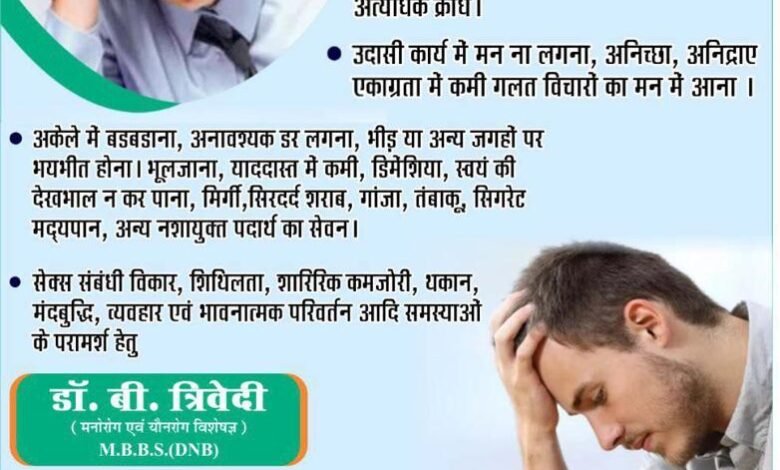 अग्रवाल नर्सिंग होम बसना में 22 दिसंबर को उपलब्ध रहेंगे डॉ. बी. त्रिवेदी मनोरोग एवं यौनरोग विशेषज्ञ