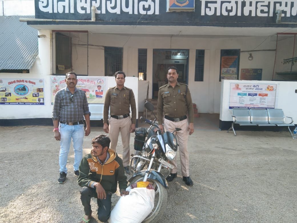 पुलिस अधीक्षक महासमुंद धर्मेन्द्र सिंह के निर्देशन में अतिरिक्त पुलिस अधीक्षक आकाश राव गिरेपुंजे एवम एसडीओपी सरायपाली अभिषेक केशरी के मार्गदर्शन में अपराध एवं अपराधिक गतिविधियों पर अंकुश लगाने की मुहिम में तारतम्य में जिले के समस्त थाना एवं चौकी प्रभारियों को जिले में अवैध शराब बिक्री एवं परिवहन पर अंकुश लगाने हेतु निर्देशित किया गया था अवैध गतिविधियों में संलिप्त लोगों के धरपकड़ के इसी क्रम में थाना सरायपाली के थाना प्रभारी आशीष वासनिक को आज दिनांक 19/12/2022 के जरिए मुखबिर से सूचना मिला कि एक व्यक्ति मोटरसाइकिल HF डिलक्स क्रमांक CG 06GQ 2785 में भारी मात्रा में अवैध महुआ शराब रखकर परिवहन करने सरायपाली की ओर आ रहा है व बाजारपारा की ओर जाने वाला है कि सूचना तस्दीकी हेतु हमराह स्टाफ के रवाना होकर सरायपाली पानी टंकी के पास पहुंचकर कुछ देर इंतजार किए थोड़ी देर बाद मोटरसाइकिल एचएफ डीलक्स क्रमांक सीजी 06 GQ 2785 में सवार एक व्यक्ति आता दिखा जिसके पीछे में सफेद रंग के प्लास्टिक बोरी रस्सी से बंधी थी जिसे घेराबंदी कर रोका गया पूछताछ करने पर अपना नाम सरधाराम ओगरे पिता गंगाराम ओगरे उम्र 26 साल साकिन भीखापाली थाना सरायपाली का रहने वाला बताया जिससे अवैध महुआ शराब रखे जाने को पुछताछ करने पर पीछे सफेद रंग के प्लास्टिक बोरी में महुआ शराब होना बताया जिसके कब्जे से एक सफ़ेद रंग के प्लास्टिक बोरी में भरा 25 लीटर हाथ भट्टी महुआ शराब, एवम परिवहन में प्रयुक्त मोटर साइकल HF डिलक्स क्रमांक CG 06 GQ 2785 कीमती करीबन ₹40000 को जप्त कर आरोपी का कृत्य 34(2) आबकारी एक्ट का पाए जाने से थाना सरायपाली में अपराध क्रमांक 513/2022 धारा 34 (2) आबकारी एक्ट कायम कर आरोपी को ज्यूडिशियल रिमांड पर भेजा गया संपूर्ण कार्यवाही में एसआई अनिल पालेश्वर आरक्षक , गुलाब साहू सरफुद्दीन अंसारी, व समस्त थाना स्टाफ का विशेष योगदान रहा