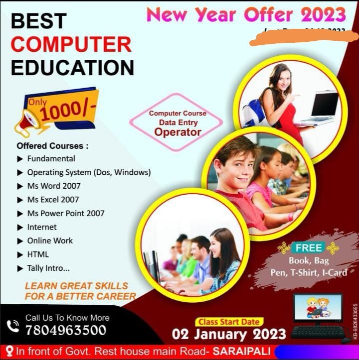 सरायपाली( काकाखबरीलाल). अंचल में पहली बार कम्प्यूटर सीखने के इच्छुक लोगों के लिए BEST COMPUTER Education लेकर आये हैं New Year Offer 2023