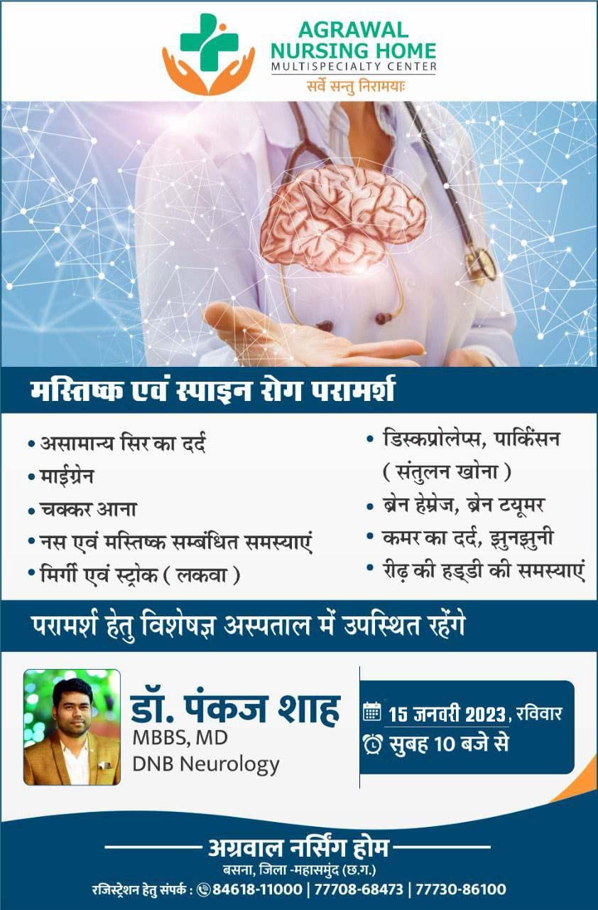 अग्रवाल नर्सिंग होम बसना में 15 जनवरी को उपलब्ध रहेंगे मस्तिष्क एवं स्पाइन रोग विशेषज्ञ डाक्टर डॉ. पंकज शाह