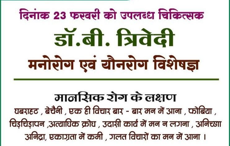 अग्रवाल नर्सिंग होम बसना में 23 फरवरी को उपलब्ध रहेंगे डॉ. बी. त्रिवेदी मनोरोग एवं यौनरोग विशेषज्ञ