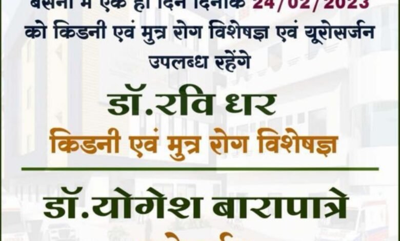 बसना में एक ही दिन दिनांक 24/02/2023 को किडनी एवं मुत्र रोग विशेषज्ञ एवं यूरोसर्जन उपलब्ध रहेंगे