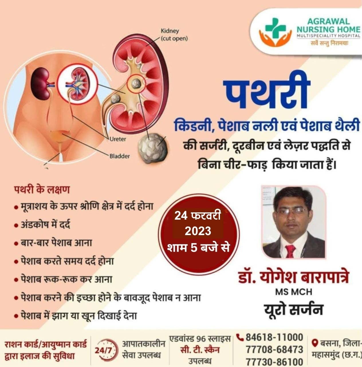 अग्रवाल नर्सिंग होम बसना में 24 फरवरी को उपलब्ध रहेंगे डॉ. योगेश बारापात्रे यूरो सर्जन