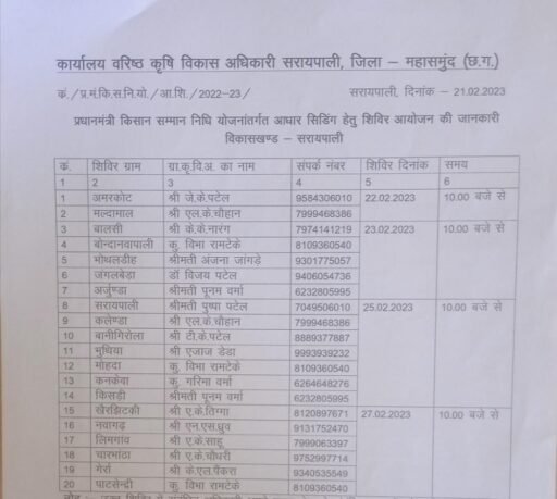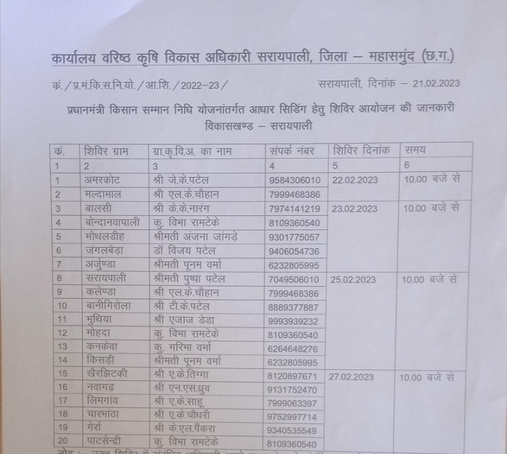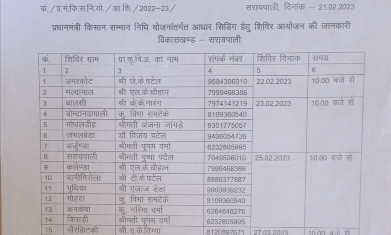 सरायपाली (काकाखबरीलाल). सरायपाली ब्लाक अंतर्गत पीएम किसान सम्मान निधि योजनांतर्गत 22से 27 फरवरी तक गांव में शिविर का आयोजन किया जा रहा है। शिविर में योजनांतर्गत कृषकों के बैंक खाता को आधार सीडिंग करने, ई-केव्हायसी कार्य, किया जा रहा है।