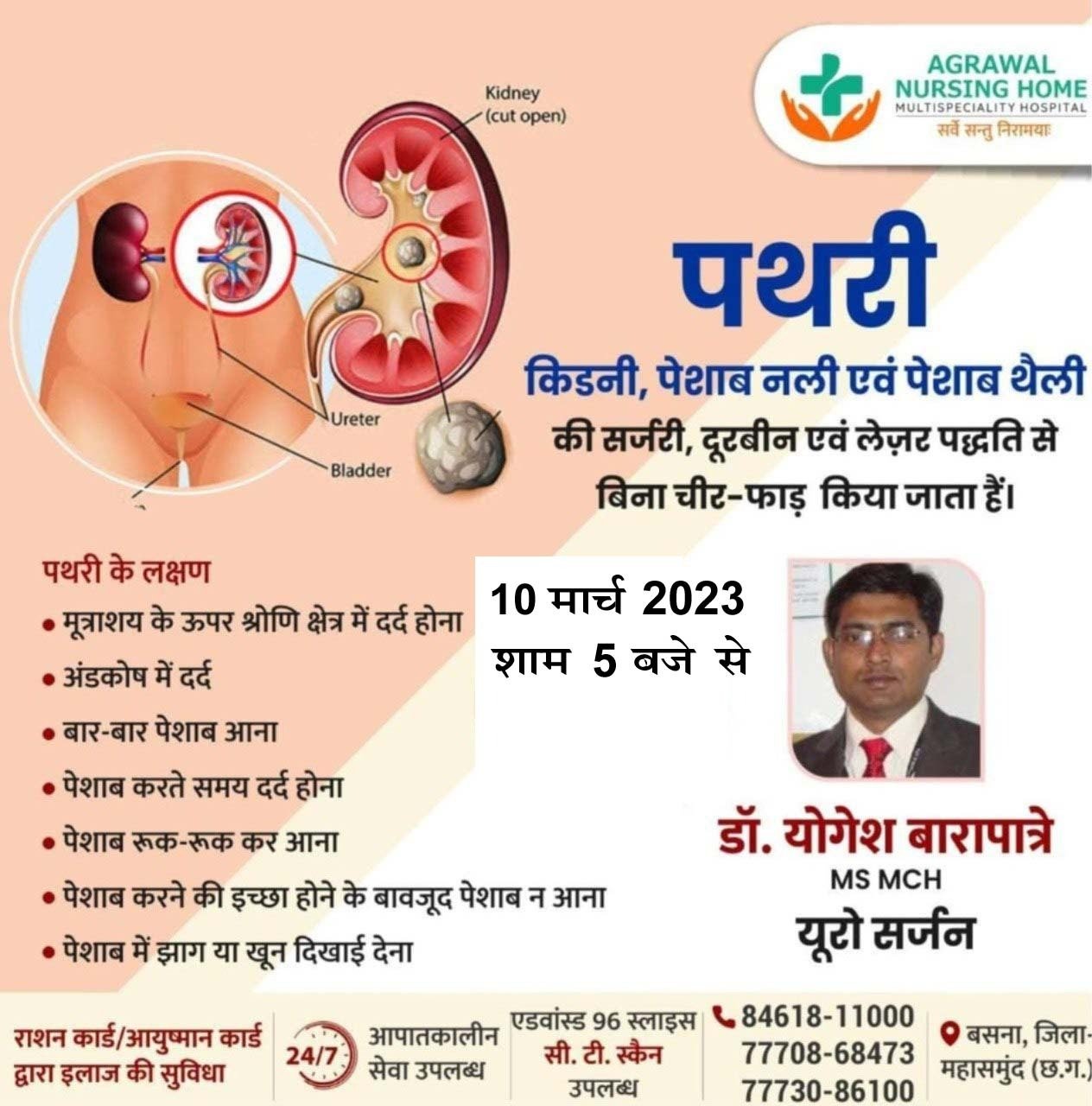 अग्रवाल नर्सिंग होम बसना में 10 मार्च को उपलब्ध रहेंगे डॉ. योगेश बारापात्रे यूरो सर्जन