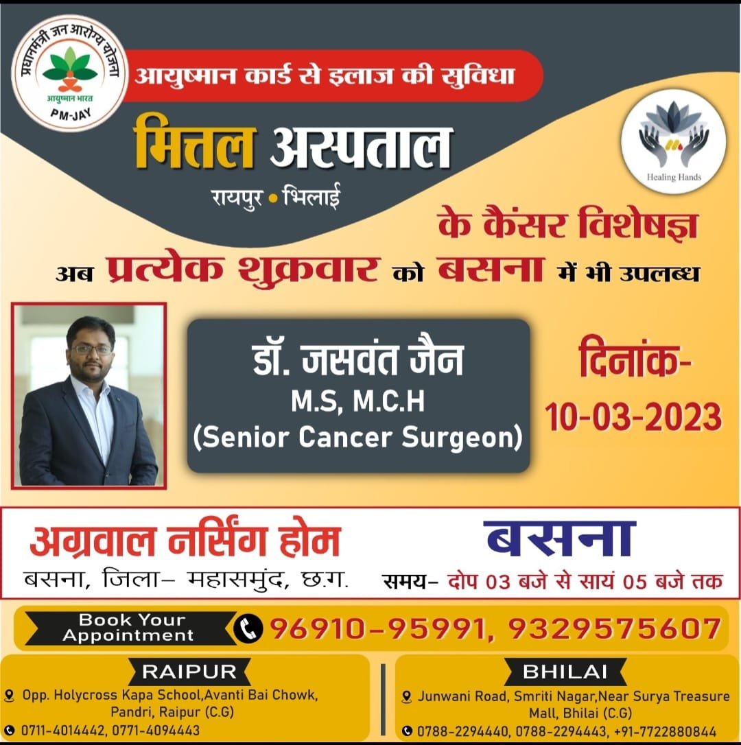 अग्रवाल नर्सिंग होम बसना में 10 मार्च को उपलब्ध रहेंगे डाक्टर जसवंत जैन ने कैसर रोग विशेषज्ञ दोपहर बाद 3 बजे से उपलब्ध 5 बजे तक पंजीयन हेतु संपर्क करे अग्रवाल 9691095991