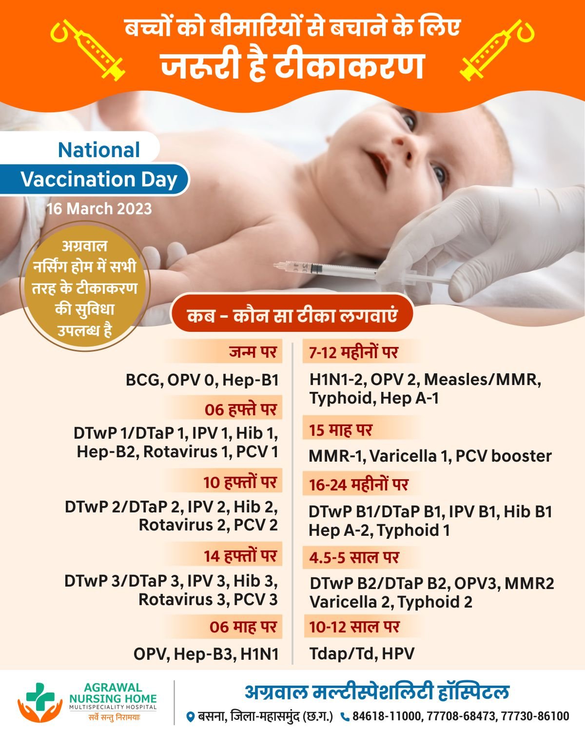 अग्रवाल नर्सिंग होम बसना में सभी प्रकार की टीकाकरण की सुविधा उपलब्ध तो आज ही संपर्क करे अग्रवाल नर्सिंग होम बसना 7773086100