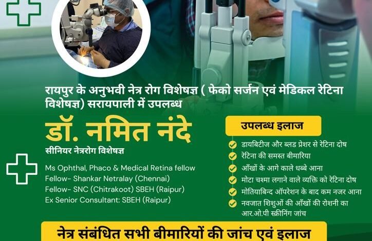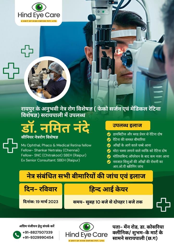 सरायपाली अंचल के लोगों के लिए शानदार मौका रायपुर के अनुभवी नेत्र रोग विशेषज्ञ फेको सर्जन एवं मेडिकल रेटिना विशेषज्ञ डाक्टर नमित नंदे 19 मार्च को सुबह 10 बजे से 2 बजे तक उपलब्ध रहेंगे हिंद आई केयर सरायपाली में .