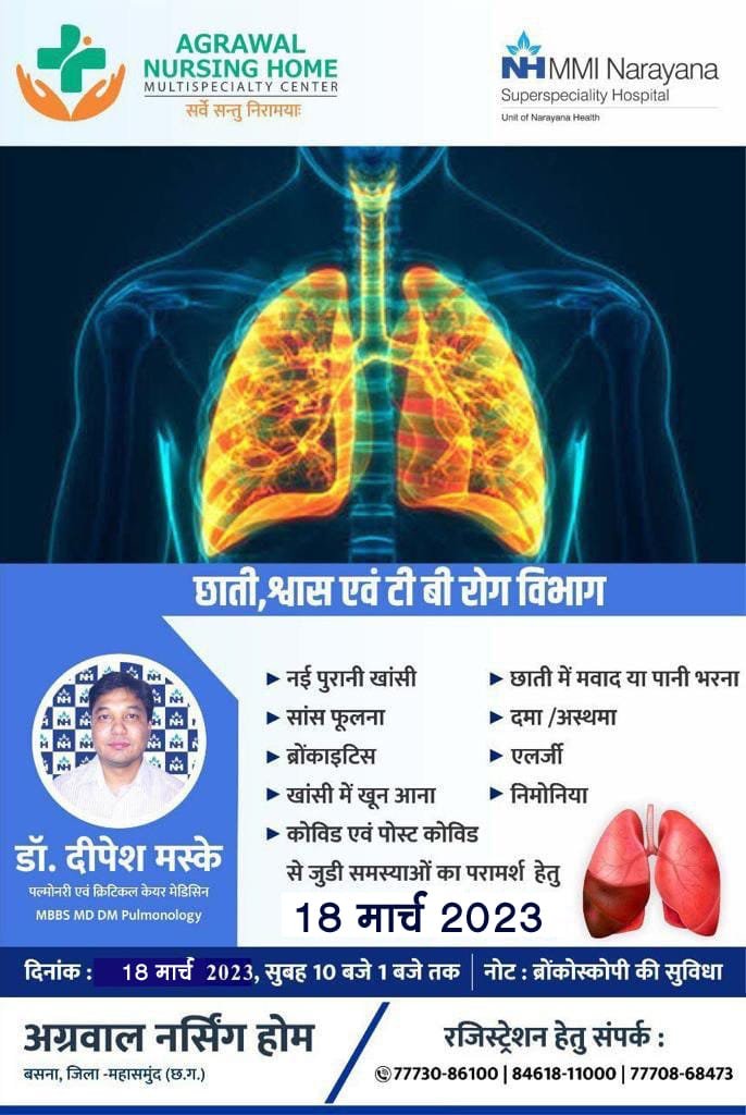 छाती, श्वास एवं टी बी रोग विशेषज्ञ डाक्टर दीपक मस्के आज उपलब्ध रहेंगे अग्रवाल नर्सिंग होम बसना में