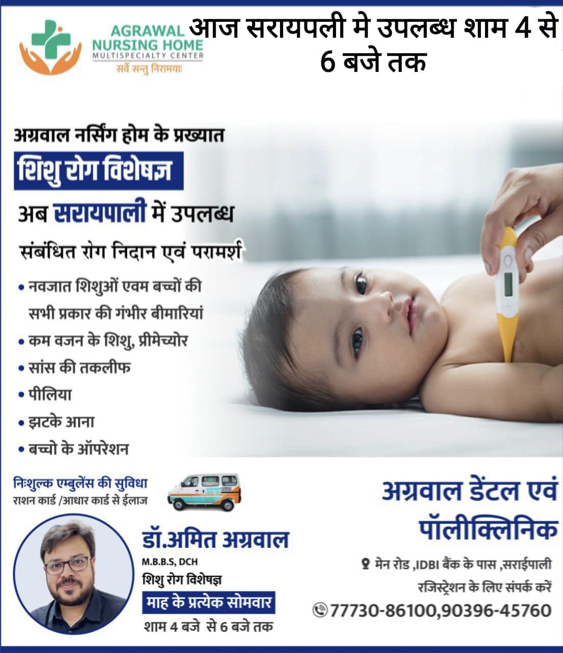 सरायपाली: आज उपलब्ध रहेंगे अग्रवाल डेंटल एवं पॉलीक्लिनिक में शिशु रोग विशेषज्ञ डाक्टर अमित अग्रवाल