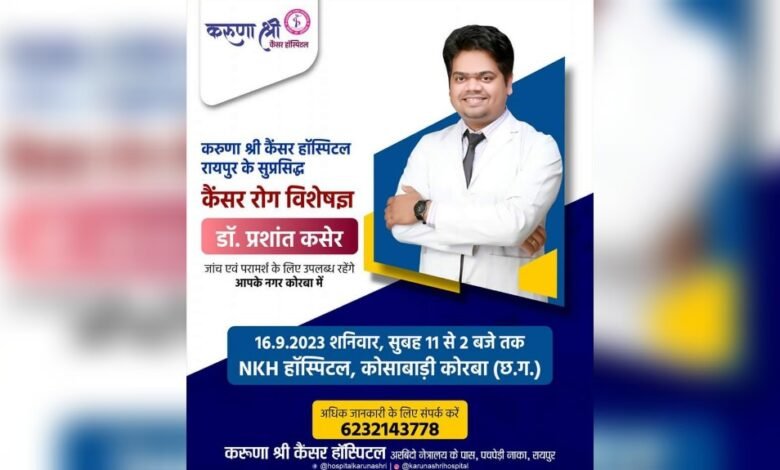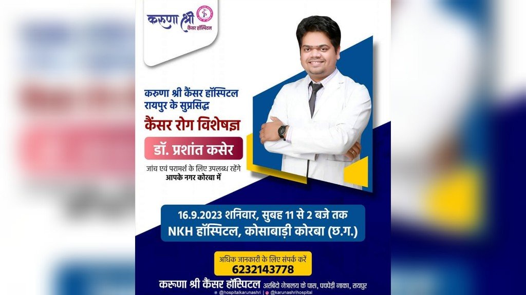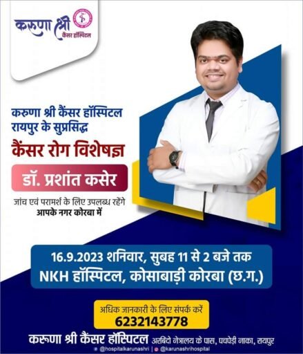 स्वास्थ्य सेवाएं@कोरबा।करुणा श्री हॉस्पिटल रायपुर के सुप्रसिद्ध कैंसर रोग विशेषज्ञ डॉ. प्रशांत कसेर आपके नगर कोरबा – NKH हॉस्पिटल, कोसाबाड़ी कोरबा (छ.ग.) में 16 सितंबर दिन शुक्रवार को उपलब्ध रहेंगे।