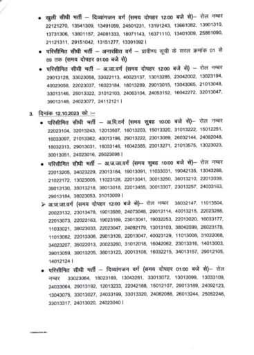 सभी चयनित अभ्यर्थियों को पंजीकृत डाक के माध्यम से व्यापम द्वारा उपलब्ध कराये गये पते पर व्यक्तिगत रूप से पत्र प्रेषित किया गया है। यदि किसी अभ्यर्थी को व्यक्तिगत रूप से पत्र प्राप्त नहीं हो पाता है, तो ऐसी स्थिति में विभाग के वेबसाईटhttps://cgwcd.gov.in/recruitmentसे निर्देश डाउनलोड कर आवश्यक अभिलेख सहित सत्यापन हेतु संचालनालय, महिला एवं बाल विकास विभाग, नवा रायपुर में उपस्थित हो सकते हैं। पर्यवेक्षकों के रिक्त पदों के लिए दस्तावेज सत्यापन हेतु खुली सीधी भर्ती एवं परिसीमित सीधी भर्ती के लिए जारी चयन सूची निम्नानुसार है:-