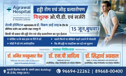 स्वास्थ्य सेवाएं @रायपुर: हड्डी रोग एंव जोड़ प्रत्यारोपण, निःशुल्क ओपीडी एंव सर्जरी अब रायपुर के अग्रवाल हॉस्पिटल में 15 जून दिन बुधवार को हो रहा है जिसमें क्षेत्र के मरीज आकर उक्त संबंधित समस्याओं को लेकर इलाज करा सकते हैं।