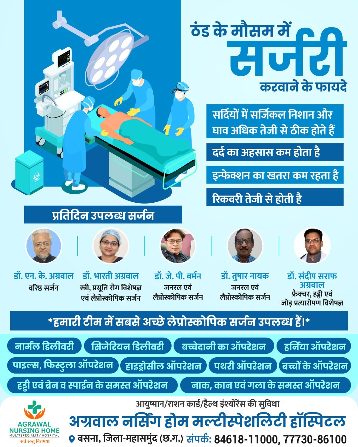 Home/छत्तीसगढ़/ठंड के मौसम में सर्जरी करवाने के फायदे… अग्रवाल नर्सिग में सर्जन की टीम प्रतिदिन उपलब्ध छत्तीसगढ़ ठंड के मौसम में सर्जरी करवाने के फायदे… अग्रवाल नर्सिग में सर्जन की टीम प्रतिदिन उपलब्ध छत्तरसिंग पटेलNovember 22, 2023 1,125 Less than a minute Related Articles शुभा नर्सिंग होम: जानिए डिलीवरी के बाद क्या खाएं- क्या न खाएं April 22, 2026 AD#1 छत्तरसिंग पटेलNovember 22, 2023 1,125 Less than a minute Facebook Twitter WhatsApp Telegram Print