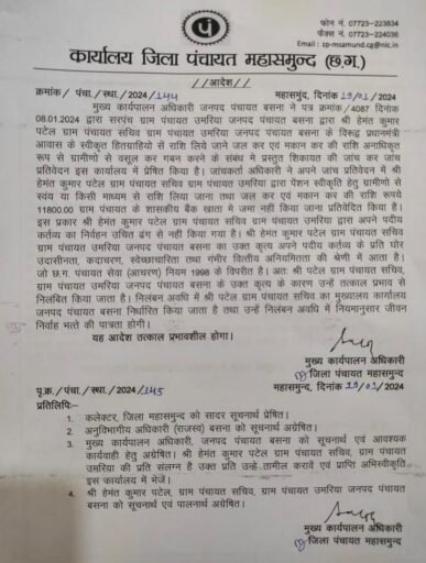 मिली जानकारी अनुसार एंव दिए गए आदेश अनुसार सरपंच ग्राम पंचायत उमरिया जनपद पंचायत बसना द्वारा हेमंत कुमार पटेल ग्राम पंचायत सचिव ग्राम पंचायत उमरिया जनपद पंचायत बसना के विरूद्ध प्रधानमंत्री आवास के स्वीकृत हितग्राहियो सें राशि लिये जाने जल कर एवं मकान कर की राशि अनाधिकृत रूप से ग्रामीणों से वसूल कर गबन करने के संबंध मे प्रस्तुत शिकायत की जांच कर जांच प्रतिवेदन इस कार्यालय में प्रेषित किया गया था। जिसकी जांचकर्ता अधिकारी ने अपने जांच प्रतिवेदन में हेमंत कुमार पटेल ग्राम पंचायत सचिव ग्राम पंचायत उमरिया द्वारा पेंशन स्वीकृति हेतु ग्रामीणो से स्वंय या किसी माध्यम से राशि लिया जाना तथा जल कर एवं मकान कर की राशि रूपये 11800.00 ग्राम पंचायत के शासकीय बैंक खाता में जमा नहीं किया जाना पाया है। इस प्रकार हेमंत कुमार पटेल ग्राम पंचायत सचिव ग्राम पंचायत उमरिया द्वारा अपने पदीय कर्तव्य का निर्वहन उचित ढंग से नहीं किया गया है। हेमंत कुमार पटेल ग्राम पंचायत सचिव ग्राम पंचायत उमरिया जनपद पंचायत बसना का उक्त कृत्य अपने पदीय कर्तव्य के प्रति घोर उदासीनता, कदाचरण, स्वेच्छाचारिता तथा गंभीर वित्तीय अनियमितता की श्रेणी में आता है। जो छ.ग. पंचायत सेवा (आचरण) नियम 1998 के विपरीत है। अतः हेमंतपटेल ग्राम पंचायत सचिव, ग्राम पंचायत उमरिया जनपद पंचायत बसना के उक्त कृत्य के कारण उन्हें तत्काल प्रभाव से निलंबित किया जाता है। निलंबन अवधि में हेमकुमार पटेल ग्राम पंचायत सचिव का मुख्यालय कार्यालय जनपद पंचायत बसना निर्धारित किया जाता है तथा उन्हें निलंबन अवधि में नियमानुसार जीवन निर्वाह भत्ते की पात्रता होगी।