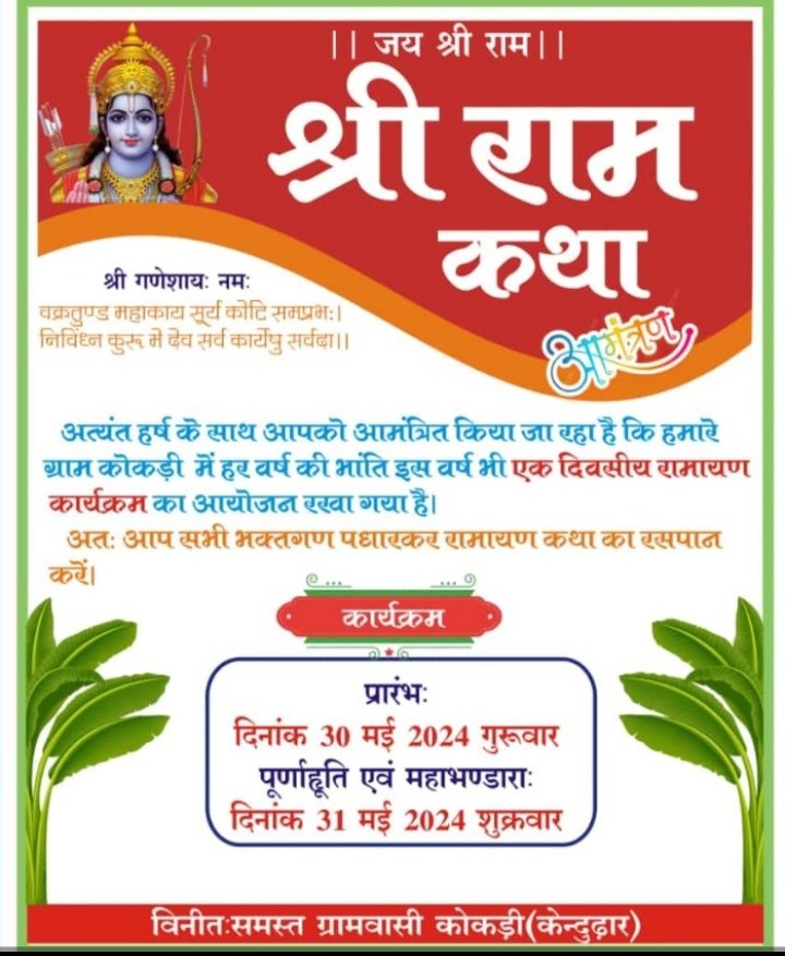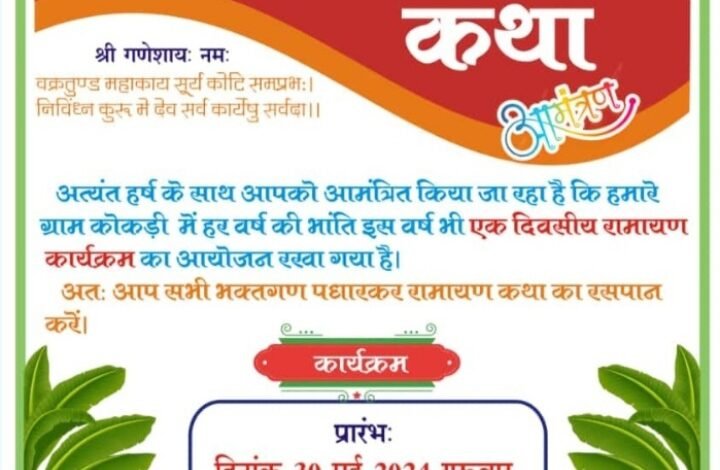 सरायपाली. ग्राम कोकड़ी में विगत वर्षों की भांति इस वर्ष भी एक दिवसीय रामायण कथा का आयोजन आज 30 मई से 31 मई तक श्री राम कथा का आयोजन किया जा रहा है. लोगों से अपील की गई है कि अधिक से अधिक संख्या में पहुंच कर श्री राम कथा का आनंद उठावें. साथ ही 31 मई को महाभंडारा का आयोजन किया गया है.