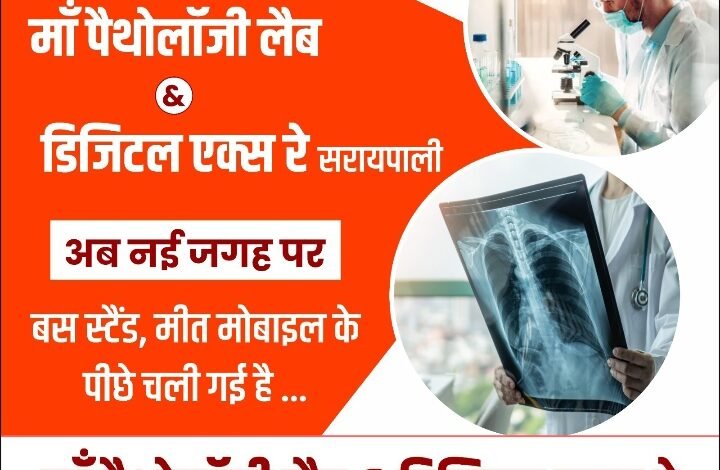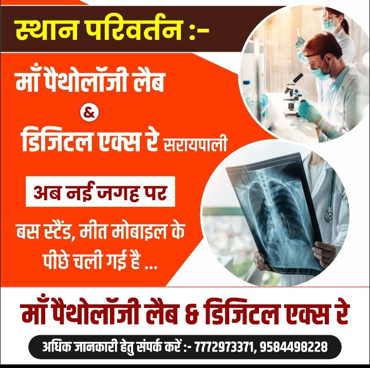 सरायपाली( काकाखबरीलाल). अंचल के लोगों के लिए सूचना माँ पैथोलॉजी लैब एंड डिजिटल एक्स रे सरायपाली अब नया जगह बस स्टैंड मीत मोबाइल के पीछे चली गई है .