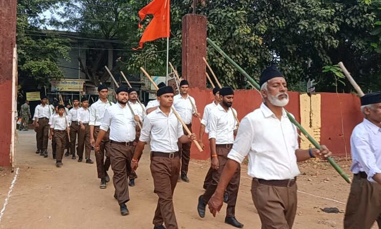 पिथौरा नगर में राष्ट्रभक्तों का निकाला पथ संचलन, संघ के पथ संचालन पर की गई पुष्प वर्षा