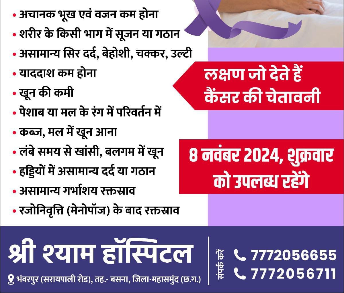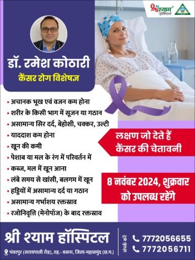 स्वास्थ्य सेवाएं@ भंवरपुर। श्री श्याम हॉस्पिटल भंवरपुर ( सरायपाली रोड़) में संजीविनी हॉस्पिटल के सुप्रसिद्ध कैंसर रोग विशेषज्ञ डॉ. रमेश कोठारी अब आपके शहर भंवरपुर में 08 नवंबर को उपलब्ध रहेंगे। क्षेत्र की सुविधाओं को ध्यान में रखते हुए लोगों को अब बड़े शहरों के चक्कर काटने की जरूरत नहीं है क्योंकि अब बड़े शहरों के डॉक्टर आपके नजदीकी हॉस्पिटल में उपलब्ध हैं जहां आकर आप उचित सलाह एंव उपचार आसानी से प्राप्त कर सकते हैं।