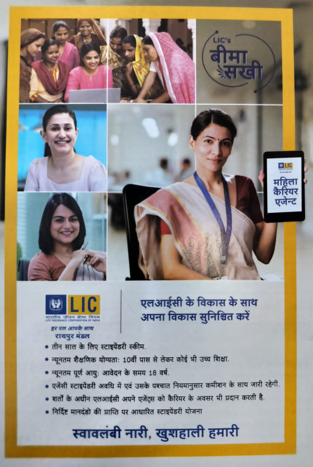 सरायपाली@ काकाखबरीलाल। बेरोजगार शिक्षित महिलाओं के लिए शानदार मौका भारतीय जीवन बीमा सरायपाली ब्रांच द्वारा बीमा सखी महिला अभिकर्ता की भर्ती की जा रही है।