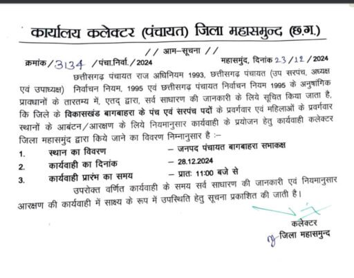 महासमुंद@ काकाखबरीलाल।कुछ दिन ब्रेक के बाद एक बार फिर जिला पंचायत, जनपद और पंचायत चुनाव का बिगुल बज चुका है। राज्य सरकार ने आज आरक्षण प्रक्रिया को पूरी करने की जिम्मेदारी कलेक्टर को दी है। इसी तारतम्य में अब जिले के जनपद सदस्या, जिला पंचायत सदस्य, सरपंच एवं पचों के आरक्षण की तिथि तय कर दी है।