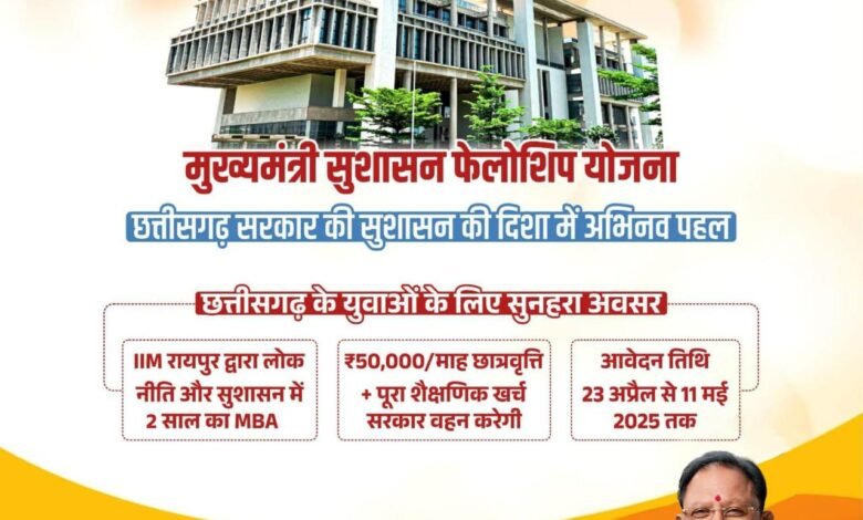मुख्यमंत्री विष्णुदेव साय के नेतृत्व में छत्तीसगढ़ सरकार ने राज्य के युवाओं को शासन और नीति निर्माण की प्रक्रिया से जोड़ने के लिए एक ऐतिहासिक पहल करते हुए ‘मुख्यमंत्री सुशासन फेलोशिप’ कार्यक्रम की शुरुआत की है। यह कार्यक्रम भारतीय प्रबंधन संस्थान (आईआईएम) रायपुर और छत्तीसगढ़ सरकार के सुशासन एवं अभिसरण विभाग के सहयोग से चलाया जाएगा। यह दो वर्षीय एमबीए डिग्री कार्यक्रम विशेष रूप से छत्तीसगढ़ के मूल निवासियों के लिए तैयार किया गया है, ताकि राज्य की प्रतिभाओं को प्रशासन में योगदान देने का अवसर मिल सके।