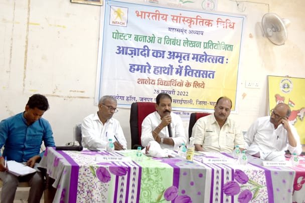 काकाखबरीलाल@सरायपाली। भारतीय सांस्कृतिक निधि (इंटैक) महासमुन्द अध्याय एवं केन्द्रीय मुख्यालय नई दिल्ली द्वारा राज्य सचिव राजेन्द्र चाण्डक के मार्गदर्शन में शालेय विद्यार्थियों के लिये आजादी का अमृत महोत्सव हमारे हाथों में विरासत विषय पर अखिल भारतीय पोस्टर बनाओ एवं निबंध लेखन प्रतियोगिता का आयोजन 28 फरवरी सोमवार को जनपद पंचायत सराय़पाली के मनरेगा हाल में इंटैक के लाईफ टाईम मेंबर यशवंत कुमार चौधरी के सहयोग से किया गया. प्रतियोगिता का शुभारंभ नगर पालिका परिषद सराय़पाली अध्यक्ष अमृत लाल पटेल के मुख्य आतिथ्य एवं अध्यक्षता संयोजक इंटैक महासमुंद दाऊलाल चंद्राकर ने की तथा अवधेश अग्रवाल अध्यक्ष प्रेस क्लब सराय़पाली एवं अखिल भारतीय अग्रवाल महासभा के राष्ट्रीय प्रवक्ता के विशिष्ट आतिथ्य में संपन्न हुआ । समस्त अतिथियों का स्वागत इंटैक परंपरा अनुसार सादा गमछा से किया गया तत्पश्चात सह- संयोजक इंटैक अध्याय महासमुंद बन्धु राजेश्वर खरे ने प्रतियोगिता के शुभारंभ अवसर पर प्रतियोगिता के सन्दर्भ में प्रतिभागियों को जानकारी देते हुए इसके उद्देश्य,महत्व पर प्रकाश डाला और इंटैक की गतिविधियों की जानकारी दी साथ ही जिले में व्यापक रूप से समृद्ध विरासतों से सम्बन्धित कविता का लयबद्ध वाचन कर खूब तालियां बटोरी।