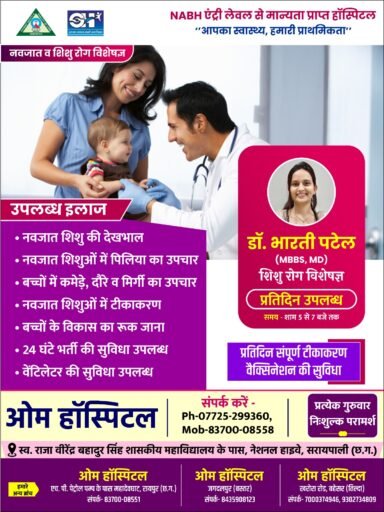 ओम हॉस्पिटल, सरायपाली में अब शिशु रोग विशेषज्ञ (बाल रोग चिकित्सक) की नियमित सेवाएँ आरंभ की जा रही हैं