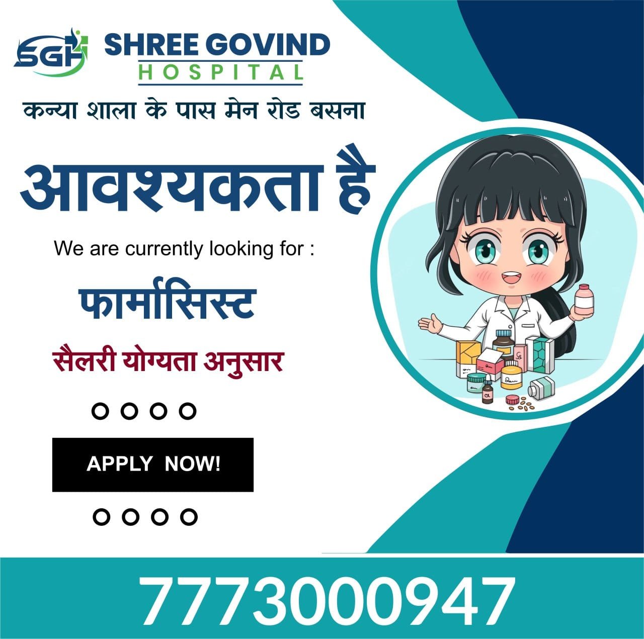काकाखबरीलाल@बसना। श्री गोविंद हॉस्पिटल बसना में काम करने के लिए फार्मेसिस्ट की आवश्यकता है।