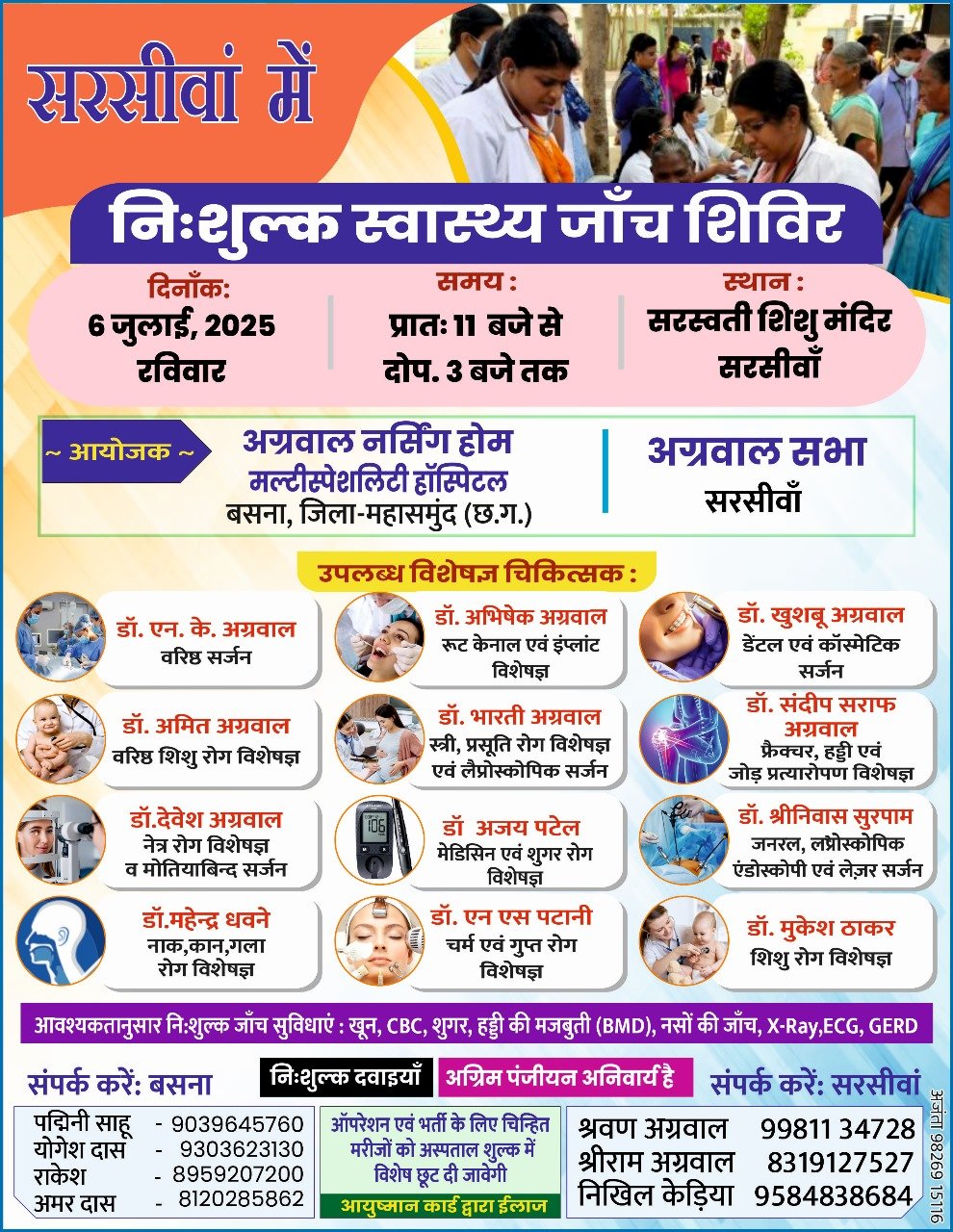 Home/छत्तीसगढ़/सरसीवां में 6 जुलाई को नि: शुल्क स्वास्थ्य जांच शिविर छत्तीसगढ़ सरसीवां में 6 जुलाई को नि: शुल्क स्वास्थ्य जांच शिविर काका खबरीलालJuly 2, 2025 2,121 Less than a minute Related Articles सरायपाली: इस स्कूल में विदाई समारोह का आयोजन March 5, 2026 AD#1 Tagsसरसीवां में 6 जुलाई को नि: शुल्क स्वास्थ्य जांच शिविर काका खबरीलालJuly 2, 2025 2,121 Less than a minute Facebook Twitter WhatsApp Telegram Print