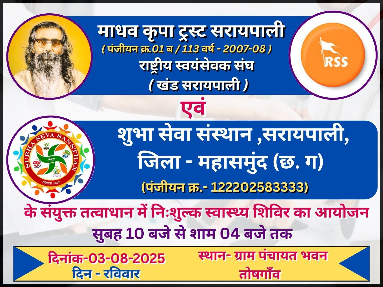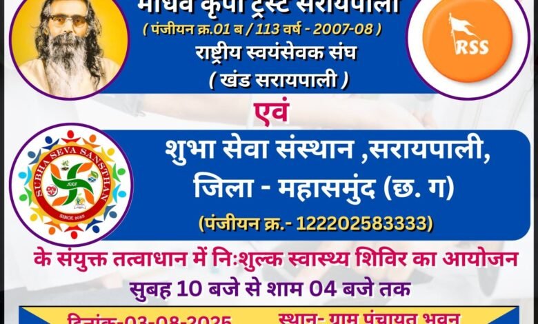 Home/सरायपाली/सरायपाली: तोषगांव में 3 अगस्त को नि: शुल्क स्वास्थ्य शिविर का आयोजन सरायपाली सरायपाली: तोषगांव में 3 अगस्त को नि: शुल्क स्वास्थ्य शिविर का आयोजन काका खबरीलालJuly 31, 2025 2,138 Less than a minute Related Articles शुभा नर्सिंग होम में स्पेशलिस्ट डॉक्टर की तत्काल आवश्यकता जानिए डिटेल्स April 18, 2026 AD#1 Tagsसरायपाली: तोषगांव में 3 अगस्त को नि: शुल्क स्वास्थ्य शिविर का आयोजन काका खबरीलालJuly 31, 2025 2,138 Less than a minute Facebook Twitter WhatsApp Telegram Print
