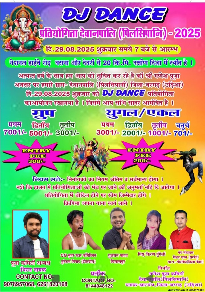 बसना। श्री गणेश पुजा के अवसर पर देवानपाली ( पिलसीपानी) में डीजे डांस प्रतियोगिता का आयोजन 29 अगस्त को रखा गया। लोगों से अपील की गई है कि अधिक से अधिक संख्या में पहुँच कर कार्यक्रम का आनंद उठावें।