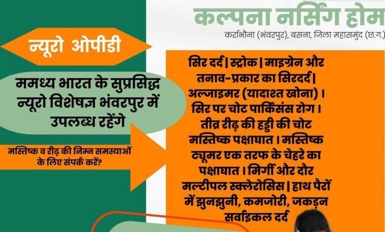 कल्पना नर्सिंग होम कर्राभौना/ भंवरपुर : मध्य भारत के सुप्रसिद्ध न्यूरो विशेषज्ञ 20 सितंबर को उपलब्ध रहेंगे, मस्तिष्क व रीढ़ की सभी समस्याओं के लिए संपर्क करें