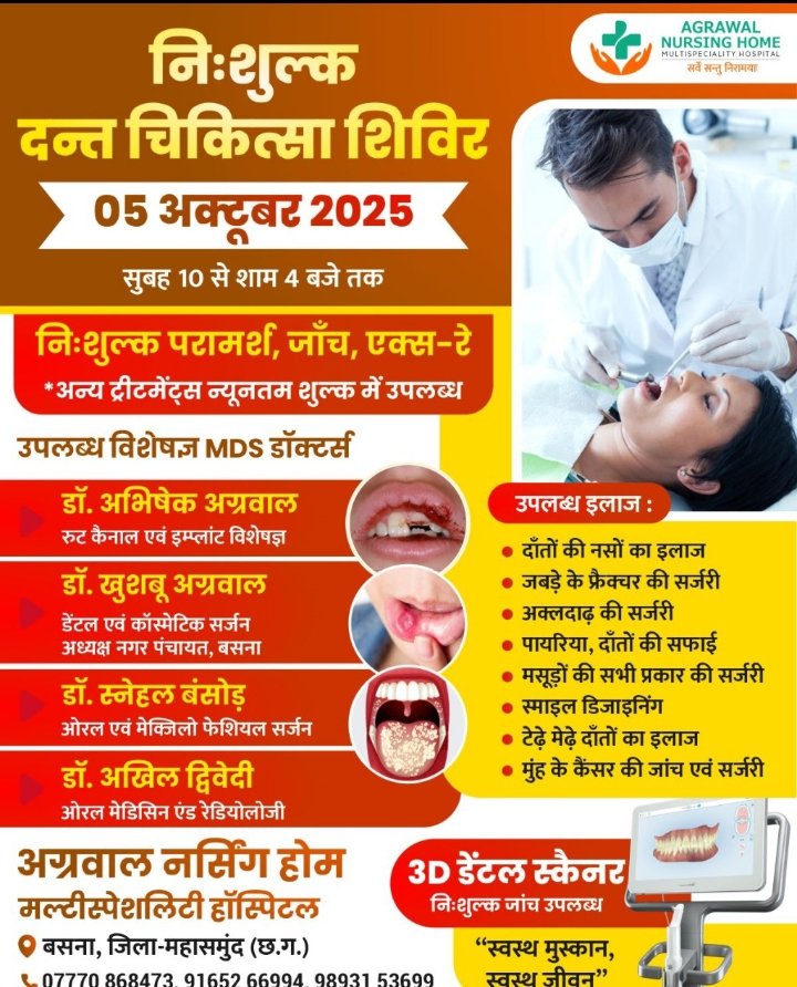 Home/छत्तीसगढ़/अग्रवाल नर्सिंग होम में 5 अक्टूबर को नि: शुल्क दंत रोग शिविर का आयोजन छत्तीसगढ़ अग्रवाल नर्सिंग होम में 5 अक्टूबर को नि: शुल्क दंत रोग शिविर का आयोजन काका खबरीलालOctober 1, 2025 2,121 Less than a minute Related Articles अग्रवाल नर्सिंग होम में 20 जनवरी को नि: शुल्क सर्जरी शिविर का आयोजन जानिए पुरी डिटेल्स January 16, 2026 AD#1 Tagsअग्रवाल नर्सिंग होम में 5 अक्टूबर को उपलब्ध रहेंगे पेट एवं लिवर रोग विशेषज्ञ डाक्टर साकेत अग्रवाल काका खबरीलालOctober 1, 2025 2,121 Less than a minute Facebook Twitter WhatsApp Telegram Print