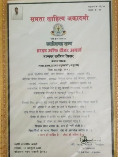 बसना@ काकाखबरीलाल। समता साहित्य अकादमी द्वारा आयोजित सम्मान समारोह में शासकीय प्राथमिक शाला गढ़पटनी, संकुल केन्द्र बसना, जिला महासमुंद (छ.ग.) के प्रधान पाठक सरविन्द सिदार को “प्राइड ऑफ टीचर अवार्ड” से सम्मानित किया गया। यह सम्मान उन्हें शिक्षा के क्षेत्र में उत्कृष्ट योगदान, छात्र-छात्राओं के सर्वांगीण विकास तथा समाज सेवा में उनके अमूल्य प्रयासों के लिए प्रदान किया गया।