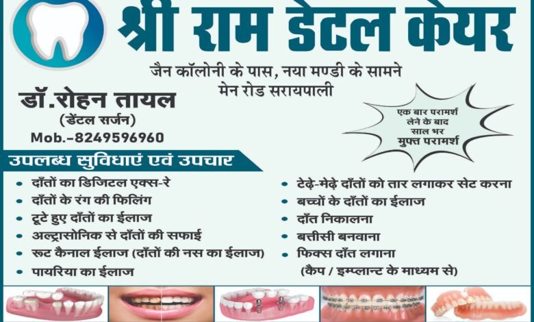 सरायपाली@ काकाखबरीलाल। अंचल के लोगों के लिए खुशखबरी आपके शहर में श्री राम डेंटल केयर लेकर आये है एक ही छत के नीचे दांतों के समस्याओं संपूर्ण ईलाज ।