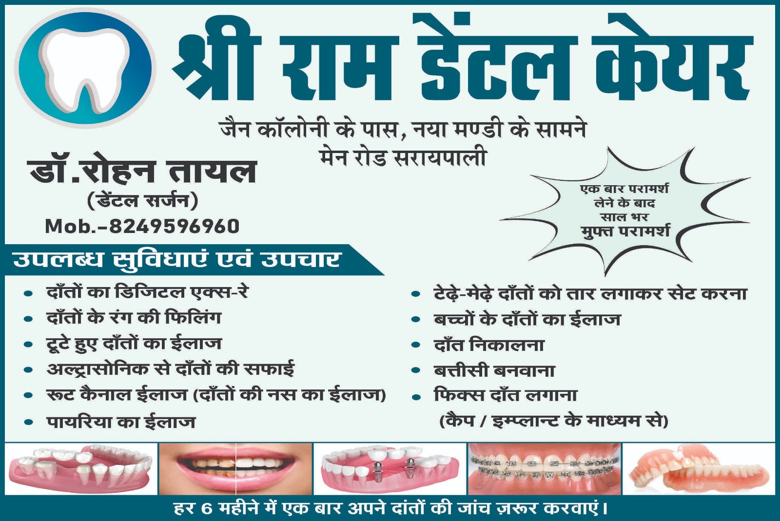 पता: श्रीराम डेंटल केयर जैन कालोनी के पास गंगाराम काम्पलेक्स मेन रोड़ सरायपाली मो.8249596960