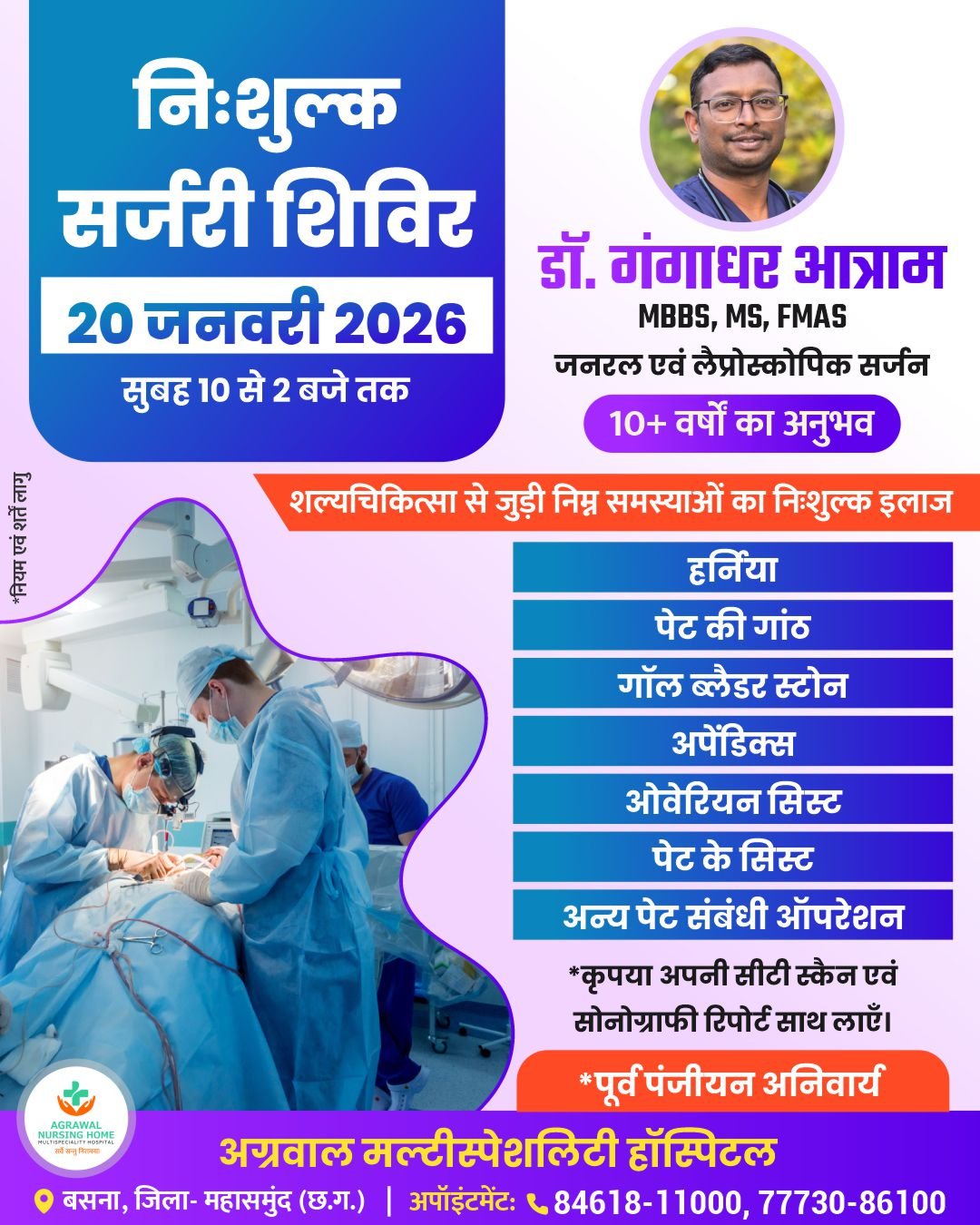 Home/छत्तीसगढ़/अग्रवाल नर्सिंग होम में 20 जनवरी को नि: शुल्क सर्जरी शिविर का आयोजन जानिए पुरी डिटेल्स छत्तीसगढ़ अग्रवाल नर्सिंग होम में 20 जनवरी को नि: शुल्क सर्जरी शिविर का आयोजन जानिए पुरी डिटेल्स काका खबरीलालJanuary 16, 2026 2,106 Less than a minute Related Articles अग्रवाल नर्सिंग होम में 16 जनवरी को यूरोलॉजी कैंप का आयोजन January 14, 2026 AD#1 Tagsअग्रवाल नर्सिंग होम में 20 जुलाई को उपलब्ध रहेंगे डाक्टर अनुपम महापात्रा पेट एवं आंत रोग विशेषज्ञ काका खबरीलालJanuary 16, 2026 2,106 Less than a minute Facebook Twitter WhatsApp Telegram Print